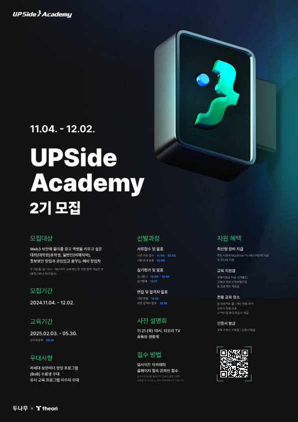 두나무 x 티오리가 함께하는 Web3보안 최고 전문가 양성과정 UPSide Academy 2기를 모집합니다.