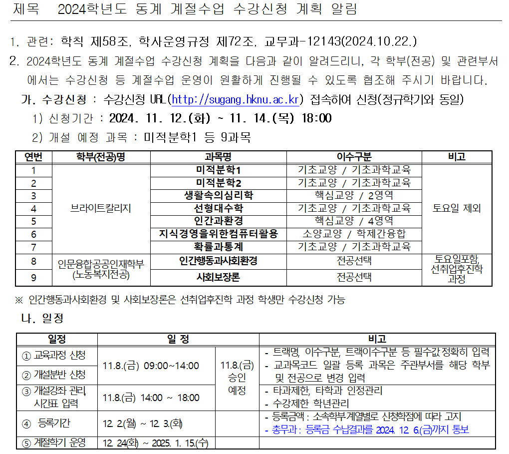 2024학년도 동계 계절수업 수강신청 계획 알림