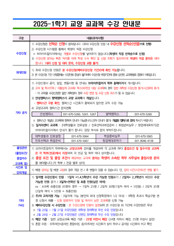 안녕하세요. 브라이트칼리지 학부 사무실입니다. 2025-1학기 교앙 교과목 시간표에 관하여 안내드립니다.