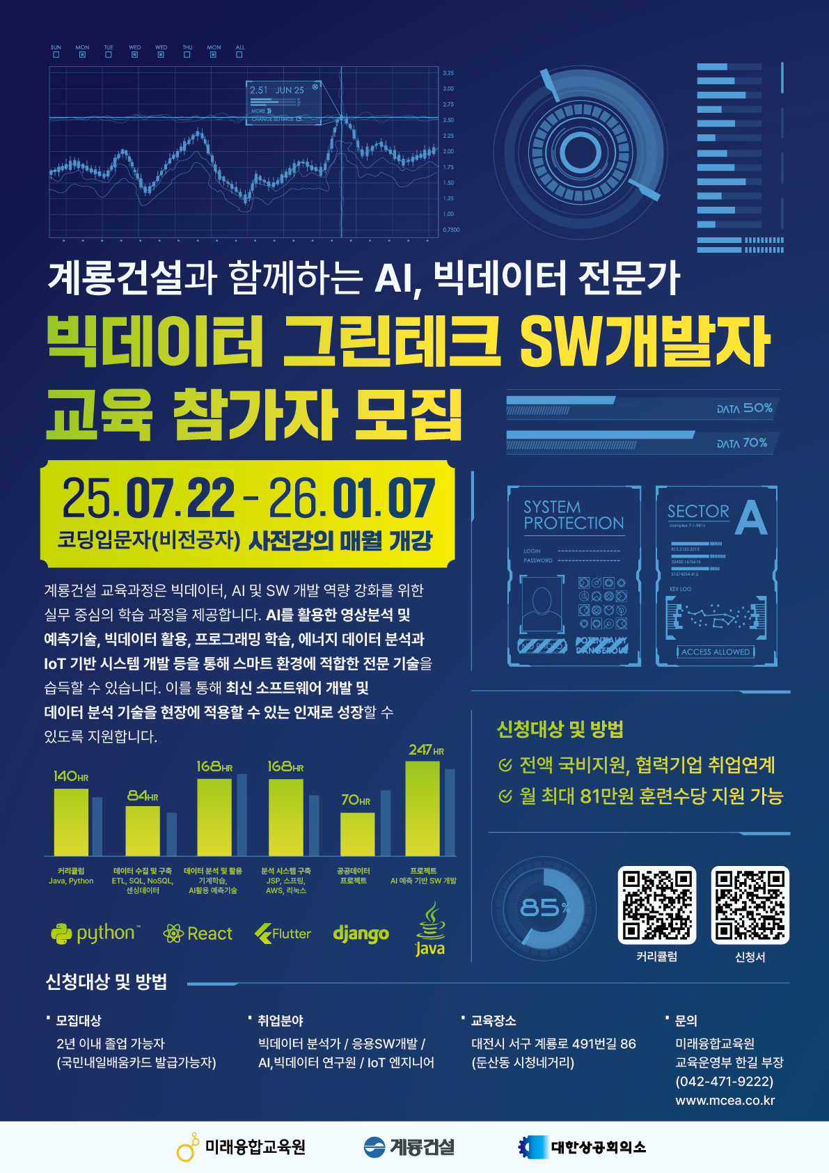빅데이터·AI 분야는 빠르게 성장 중이며, 본 과정을 통해 디지털 기술과 실무 능력을 갖춰 스마트건설, 에너지, IT 분야로 진출할 수 있습니다.