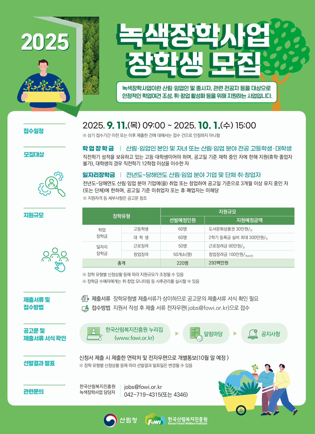 본 모집공고는 한국산림복지진흥원 홈페이지 - 공지사항 - 2025년 녹색장학사업 장학생 모집공고(https://www.fowi.or.kr/user/bbs/bbsView.do?bbsManageId=12&bbsId=8256)로 게시 하였습니다.