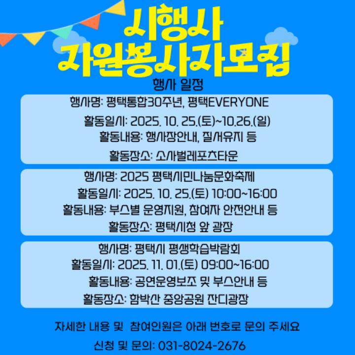 평택시에서 진행하는 시행사에 참여해 주실 대학생 자원봉사자를 모집 중입니다.