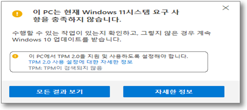 ② 'PC 상태 검사 앱' 결과 '이 PC에서 TPM 2.0을 지원 및 사용하도록 설정해야 합니다.'라는 메시지가 나온 경우, BIOS 모드로 진입하여 해당 기능을 활성화해 주어야 합니다.