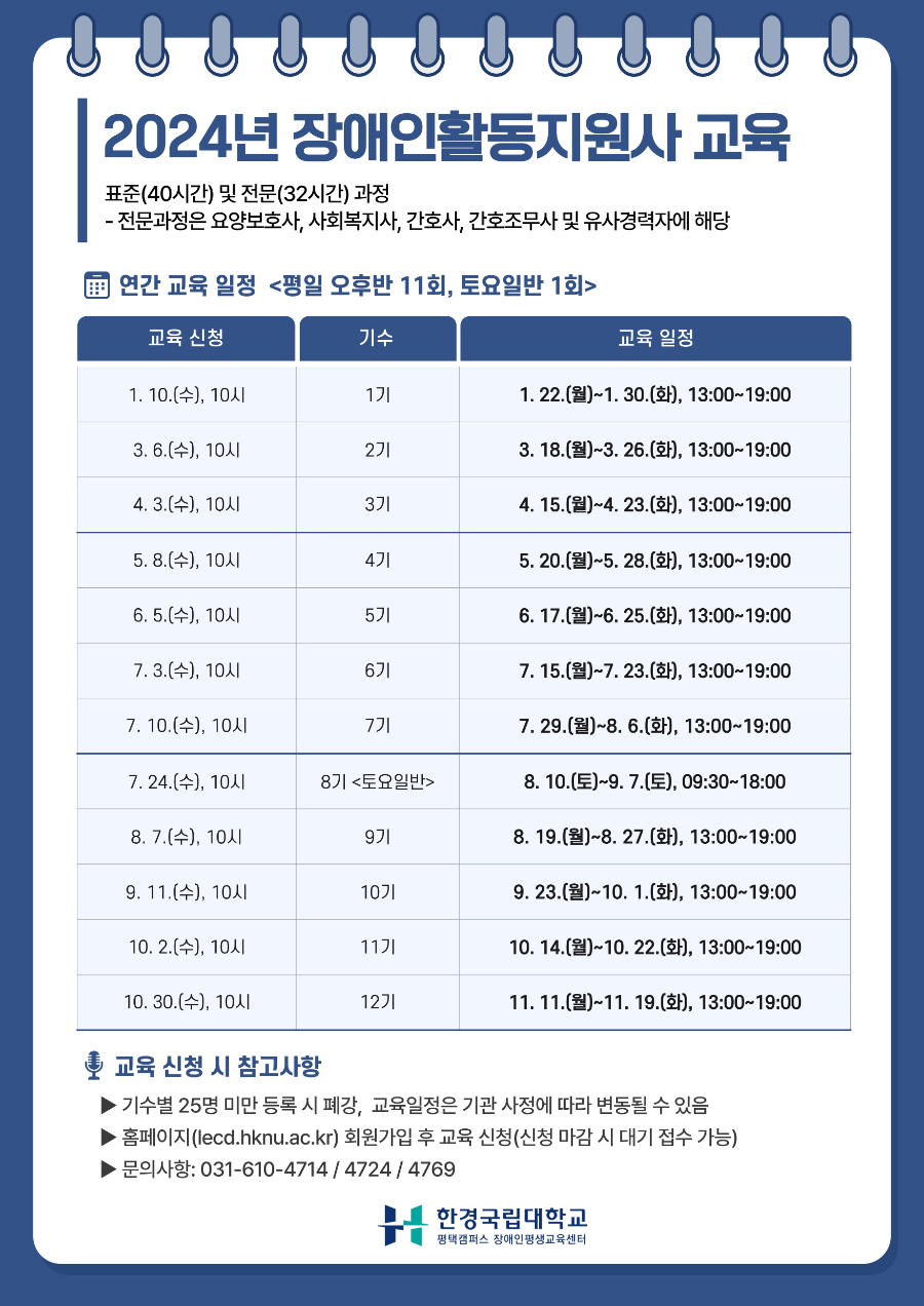 장애인평생교육원에서는 2024년도 장애인 활동지원사 교육일정을 다음과 같이 안내 드립니다.
