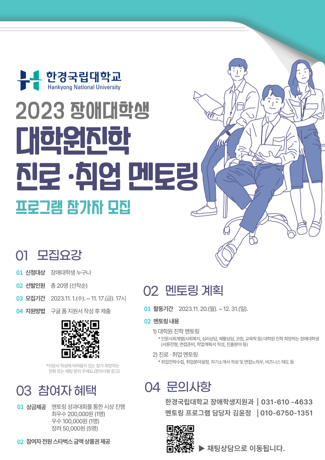 장애학생의 진학(대학원) 및 취업역량 강화를 위한「장애학생 진학․취업 멘토링 프로그램」를 진행하오니, 장애학생의 많은 참여 바랍니다.