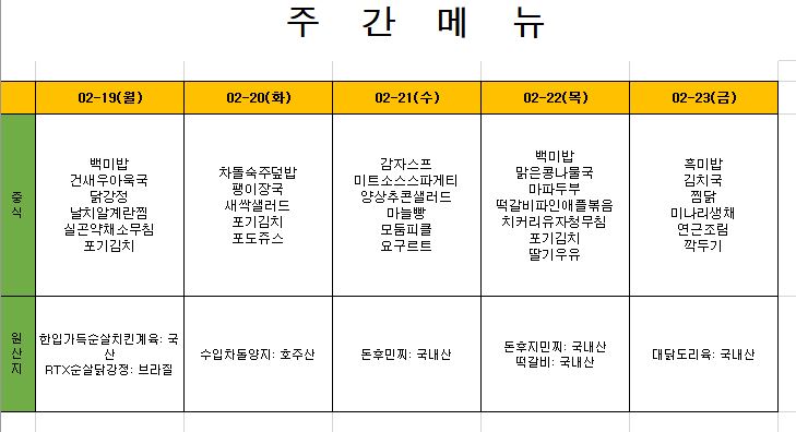 2024. 2. 19. ~ 2024. 2. 23. 주간식단표