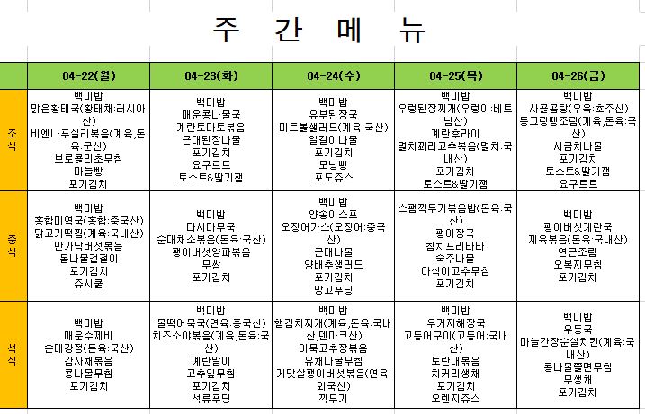 2025. 4. 21. ~ 2025. 4. 25. 주간식단표