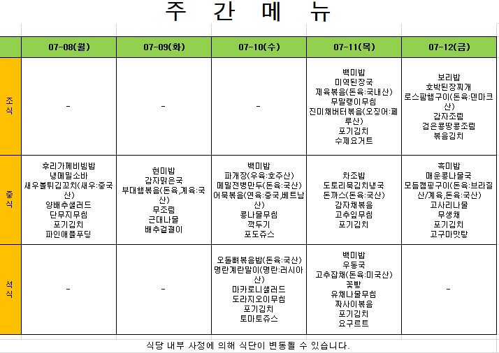 2025. 7. 7. ~ 2025. 7. 11. 주간식단표