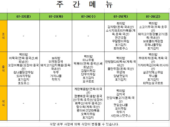 2024. 7. 22. ~ 2024. 7. 26. 주간식단표