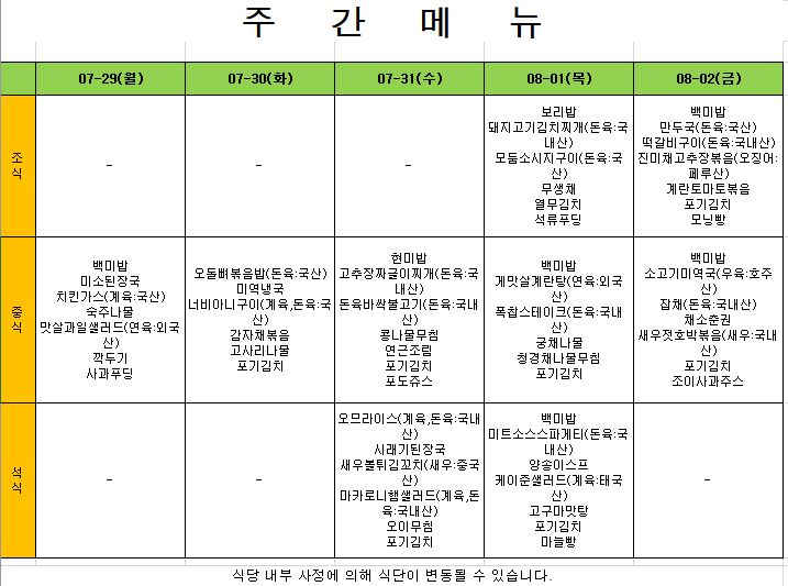 2024. 7. 29. ~ 2024. 8. 2. 주간식단표