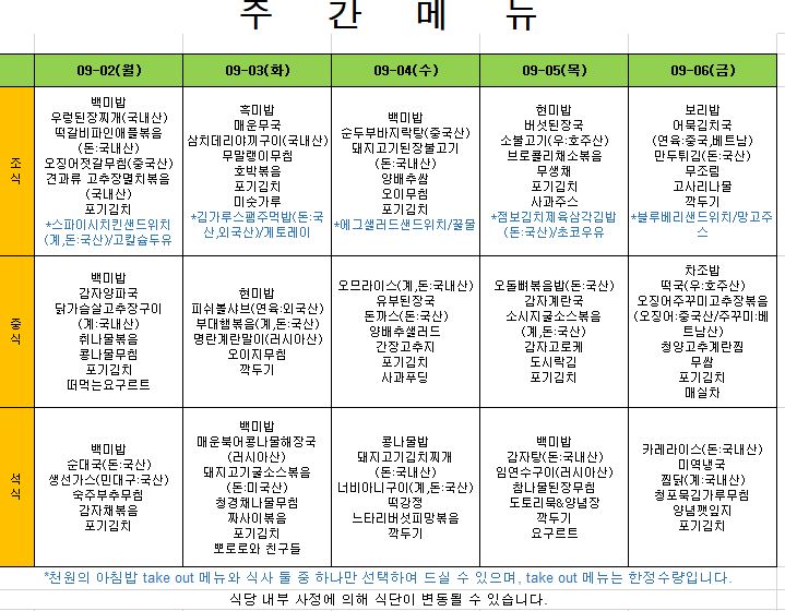 2025. 9. 1. ~ 2025. 9. 5. 주간식단표