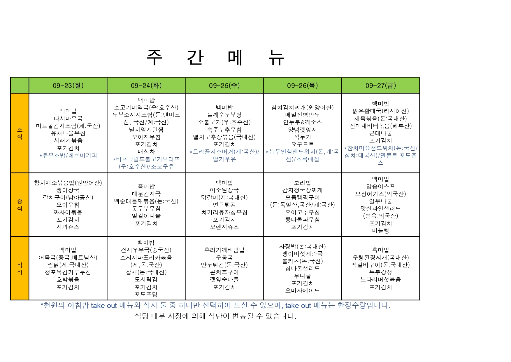 2025. 9. 22. ~ 2025. 9. 26. 주간식단표