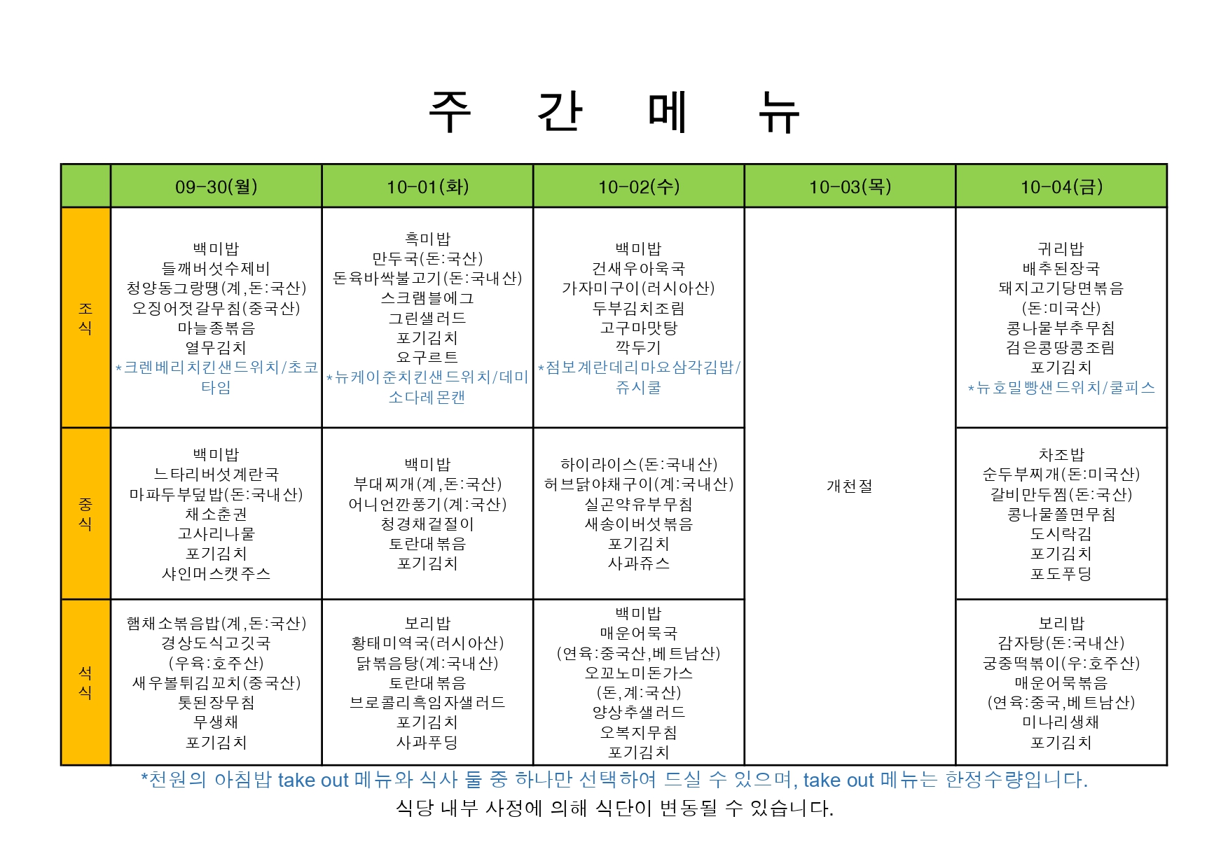 2024. 9. 30. ~ 2024. 10. 4. 주간식단표
