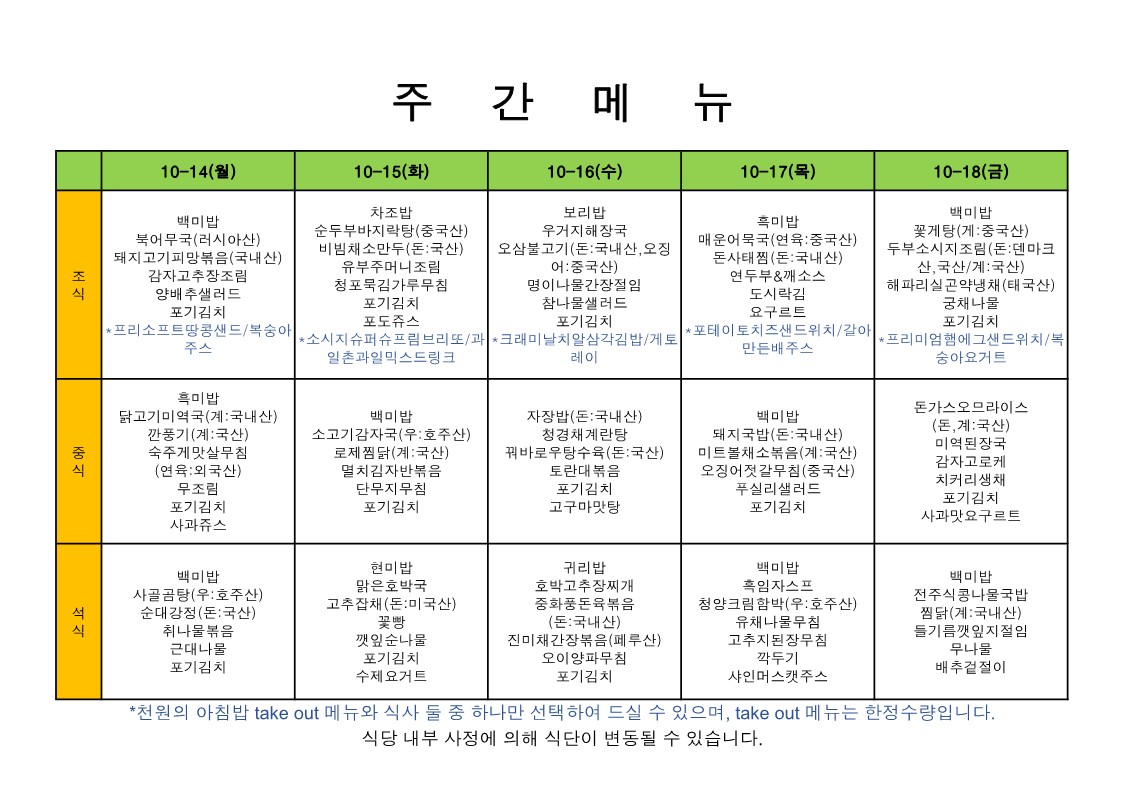 2025. 10. 13. ~ 2025. 10. 17. 주간식단표
