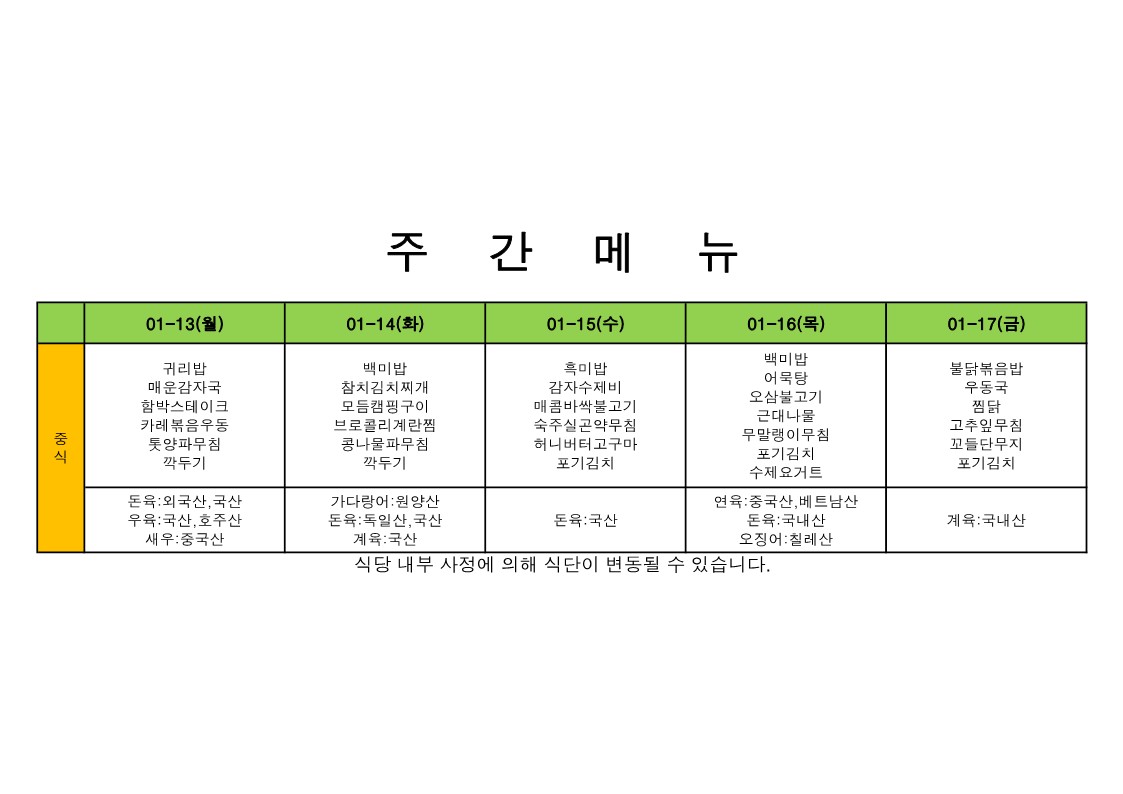 2025. 10. 13. ~ 2025. 10. 17. 주간식단표