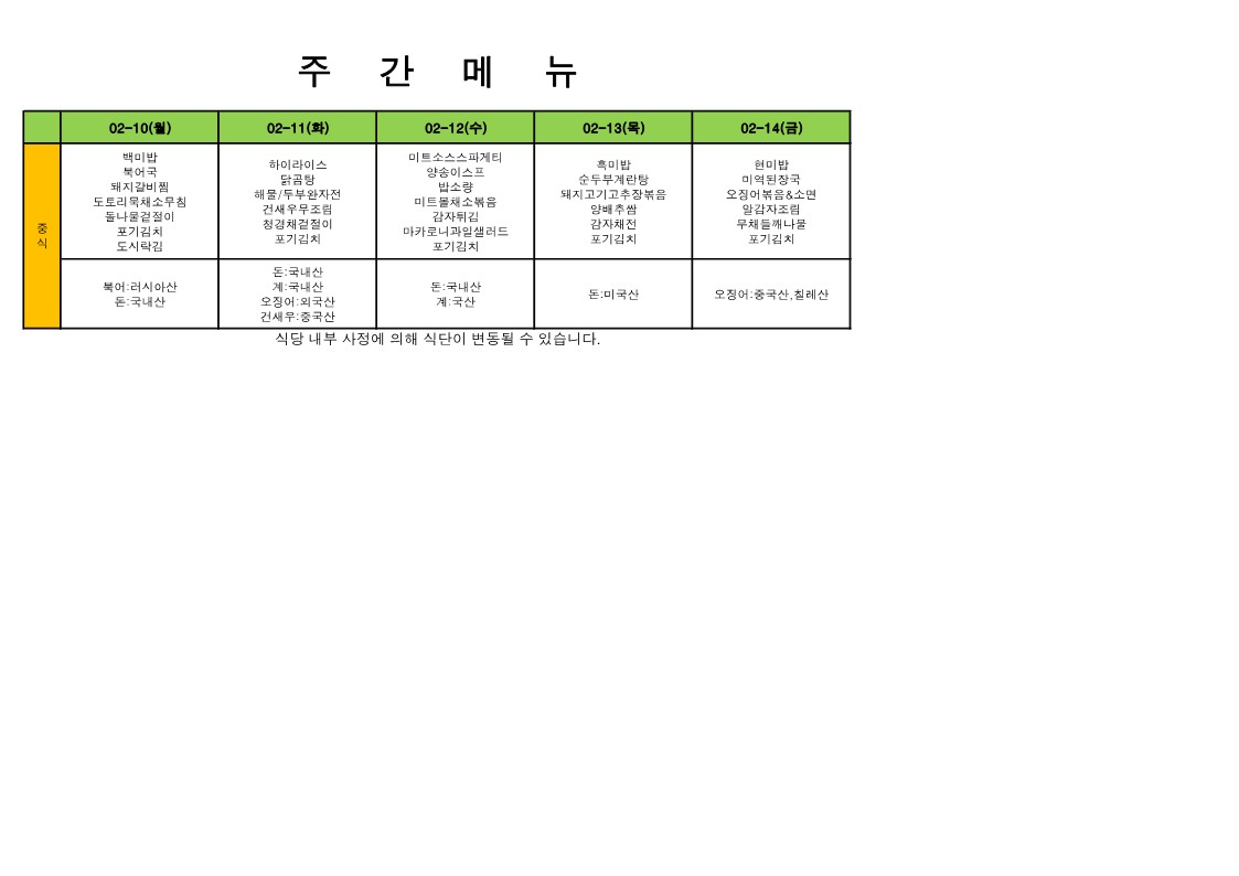2024. 2. 5. ~ 2024. 2. 9. 주간식단표