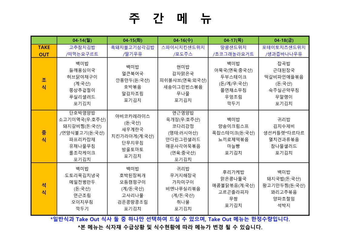 2025. 4. 14. ~ 2025. 4. 18. 주간식단표