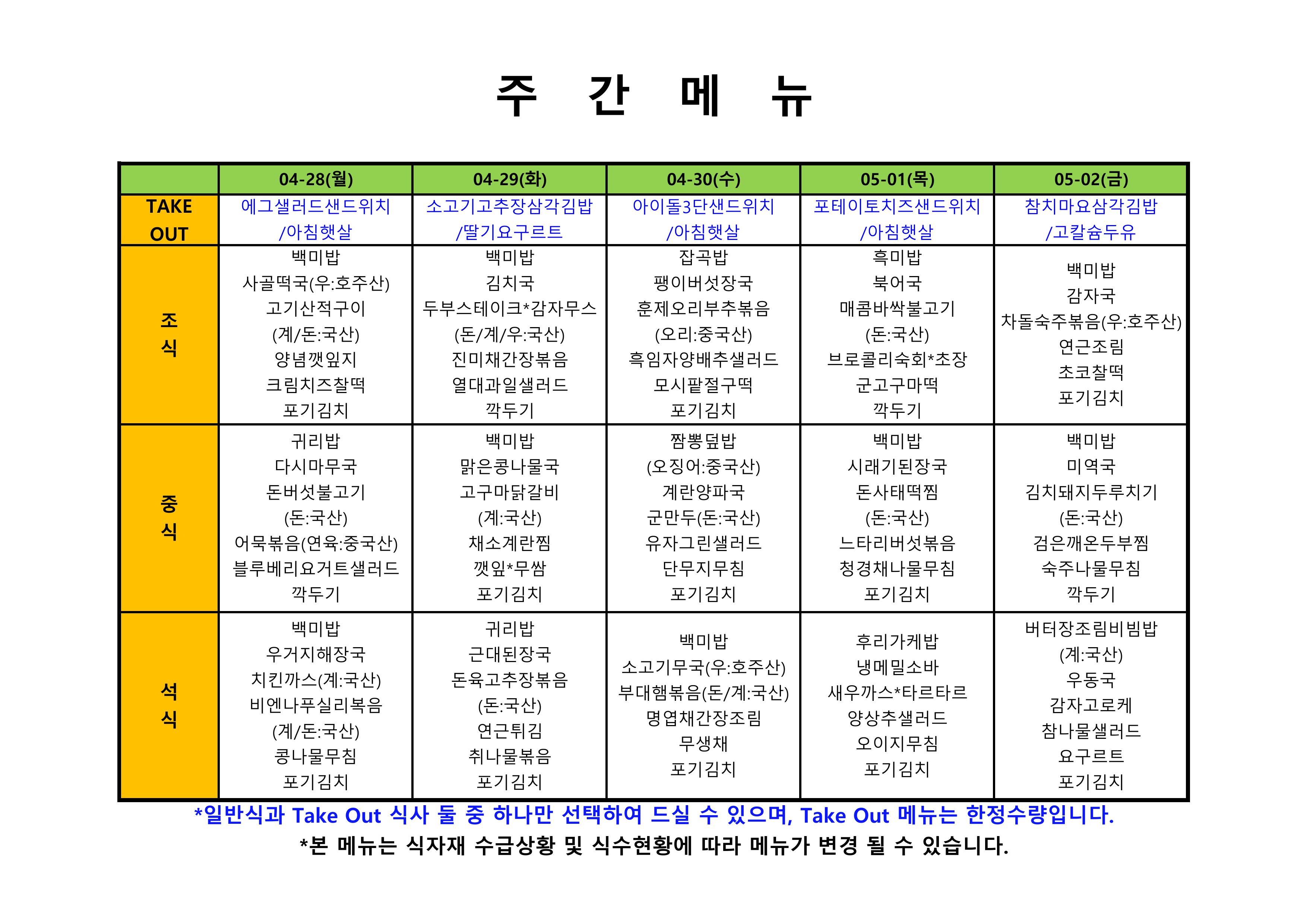2024. 4. 29. ~ 2024. 5. 3. 주간식단표