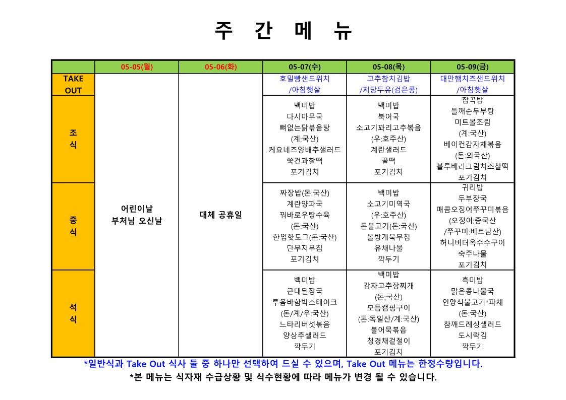 2025. 5. 5. ~ 2025. 5. 9. 주간식단표