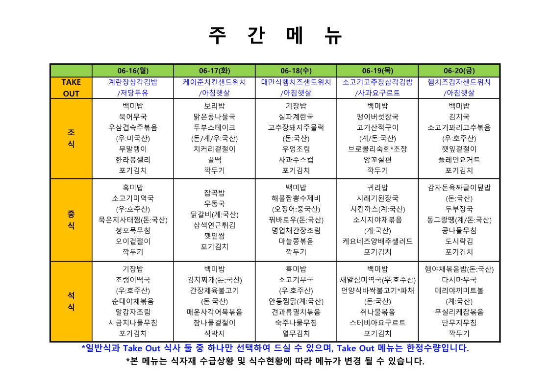 2025. 6. 16. ~ 2025. 6. 20. 주간식단표
