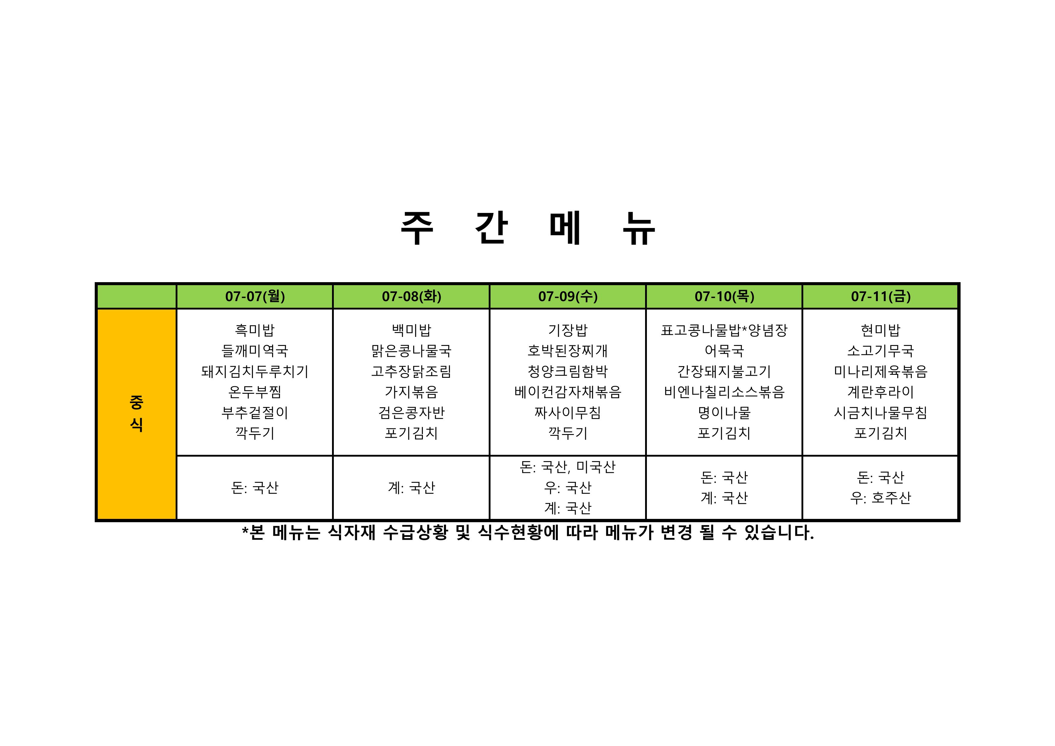 2025. 7. 7. ~ 2025. 7. 11. 주간식단표
