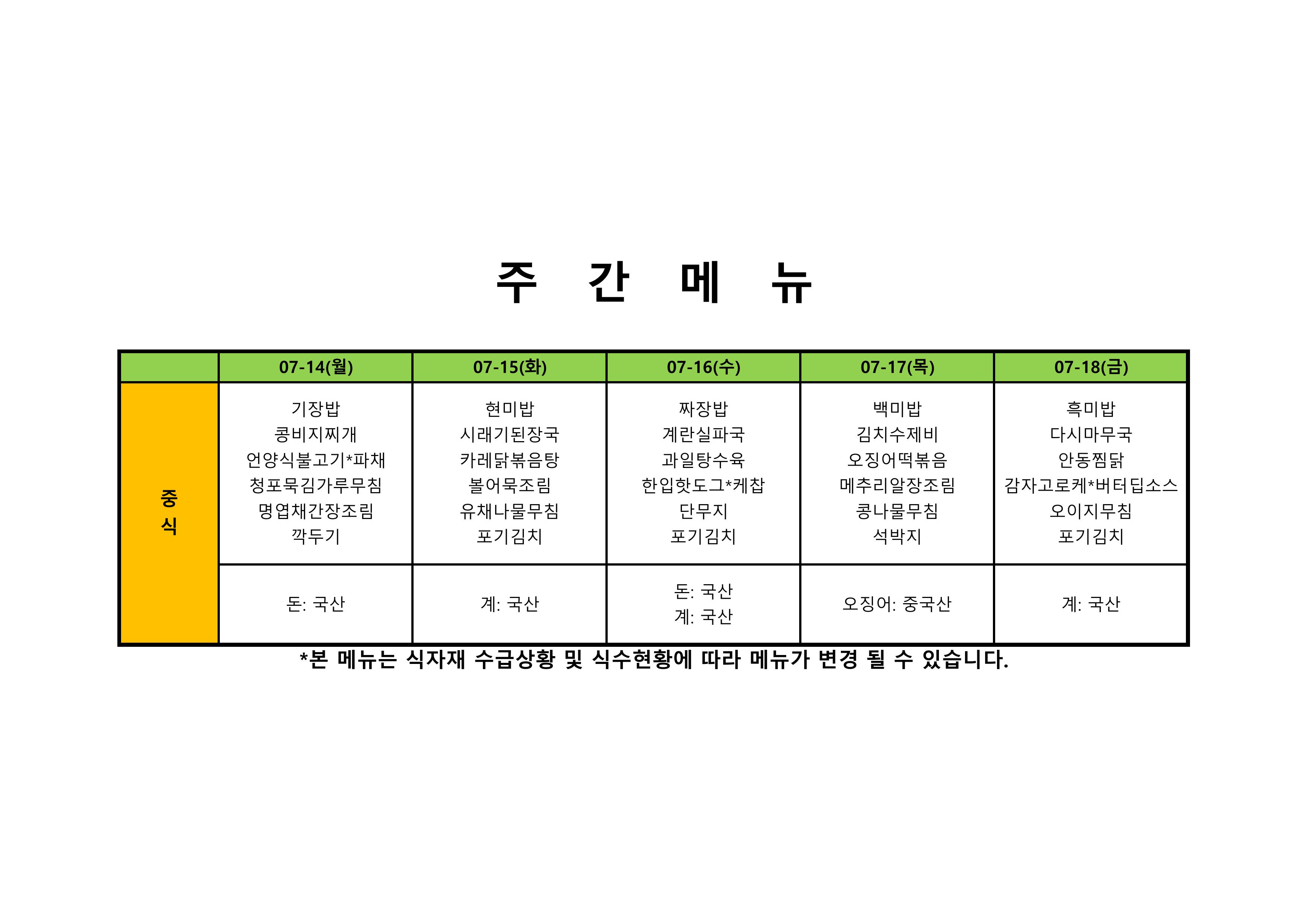 2025. 7. 14. ~ 2025. 7. 18. 주간식단표