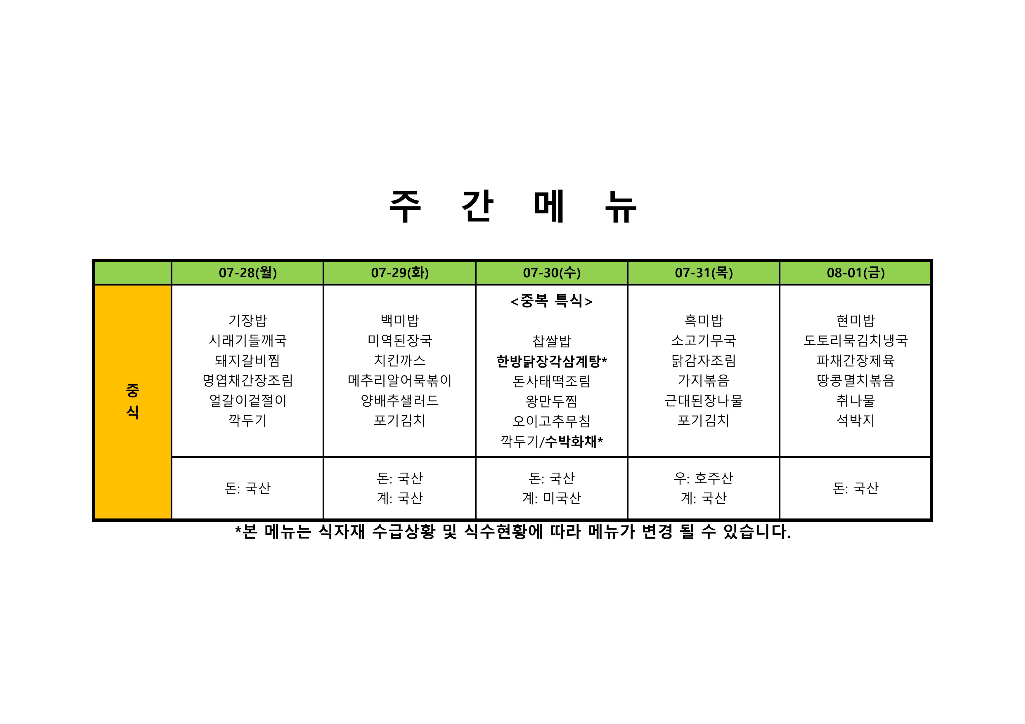 2025. 7. 28. ~ 2025. 8. 1. 주간식단표