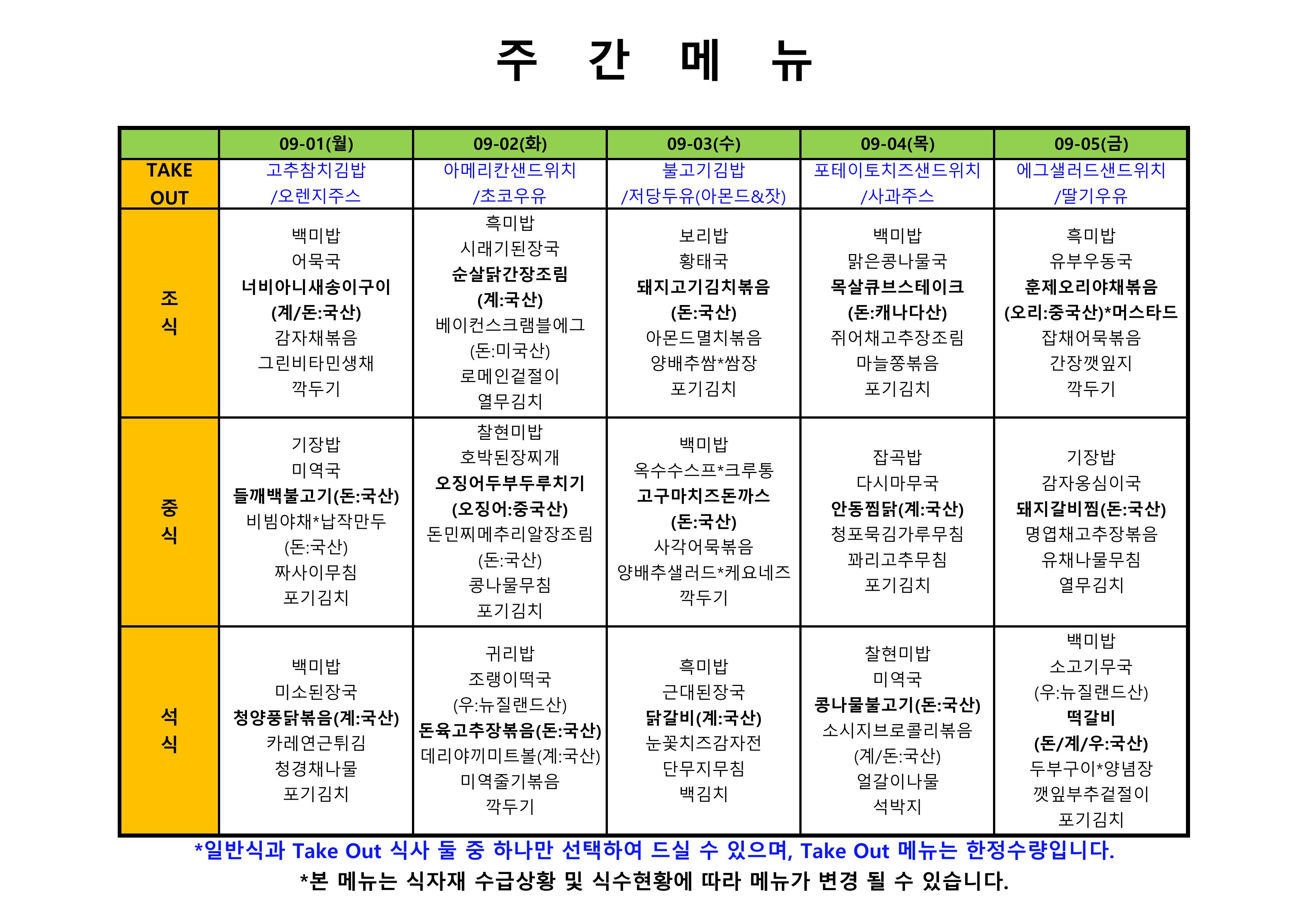 2025. 9. 1. ~ 2025. 9. 5. 주간식단표