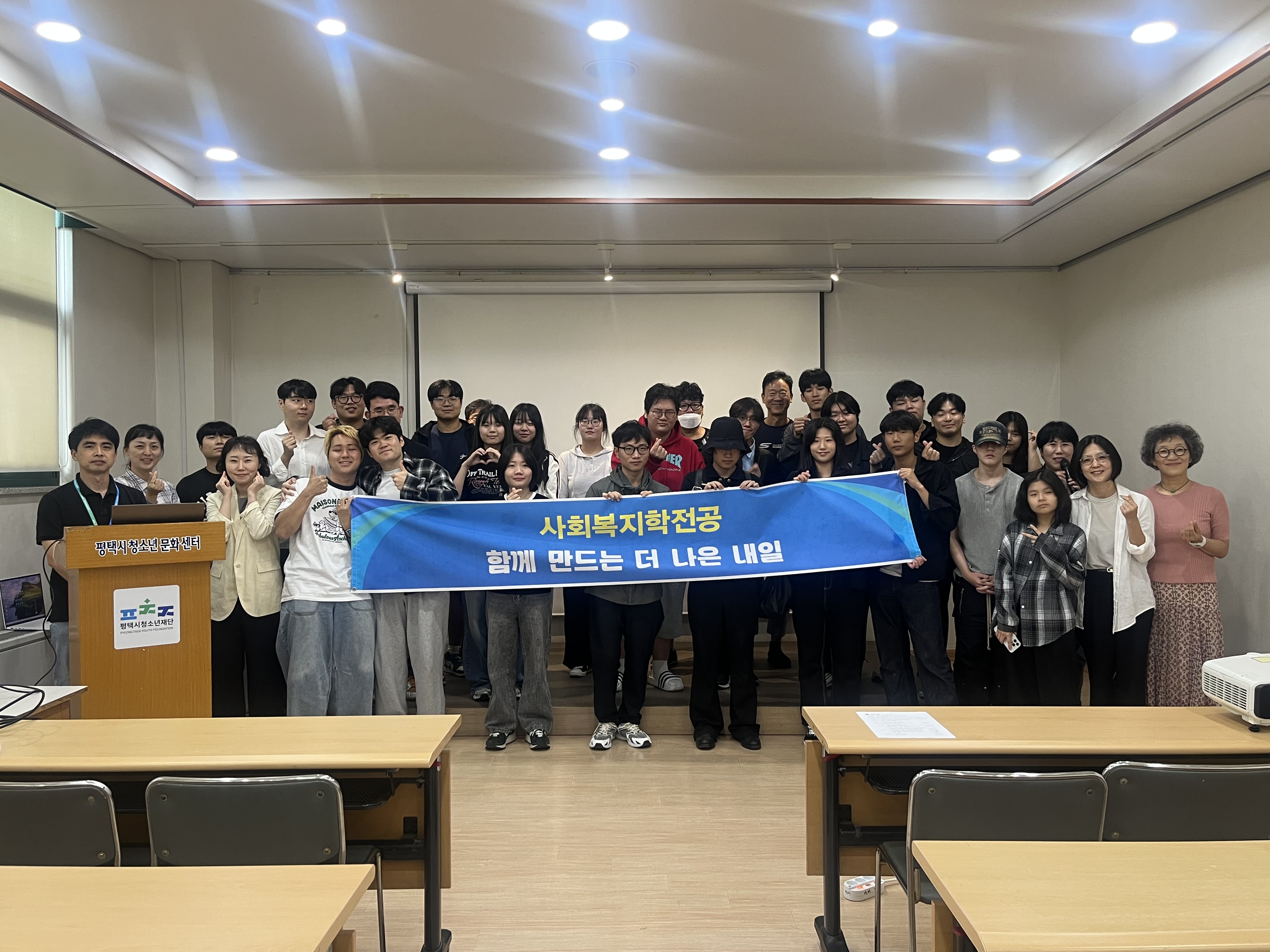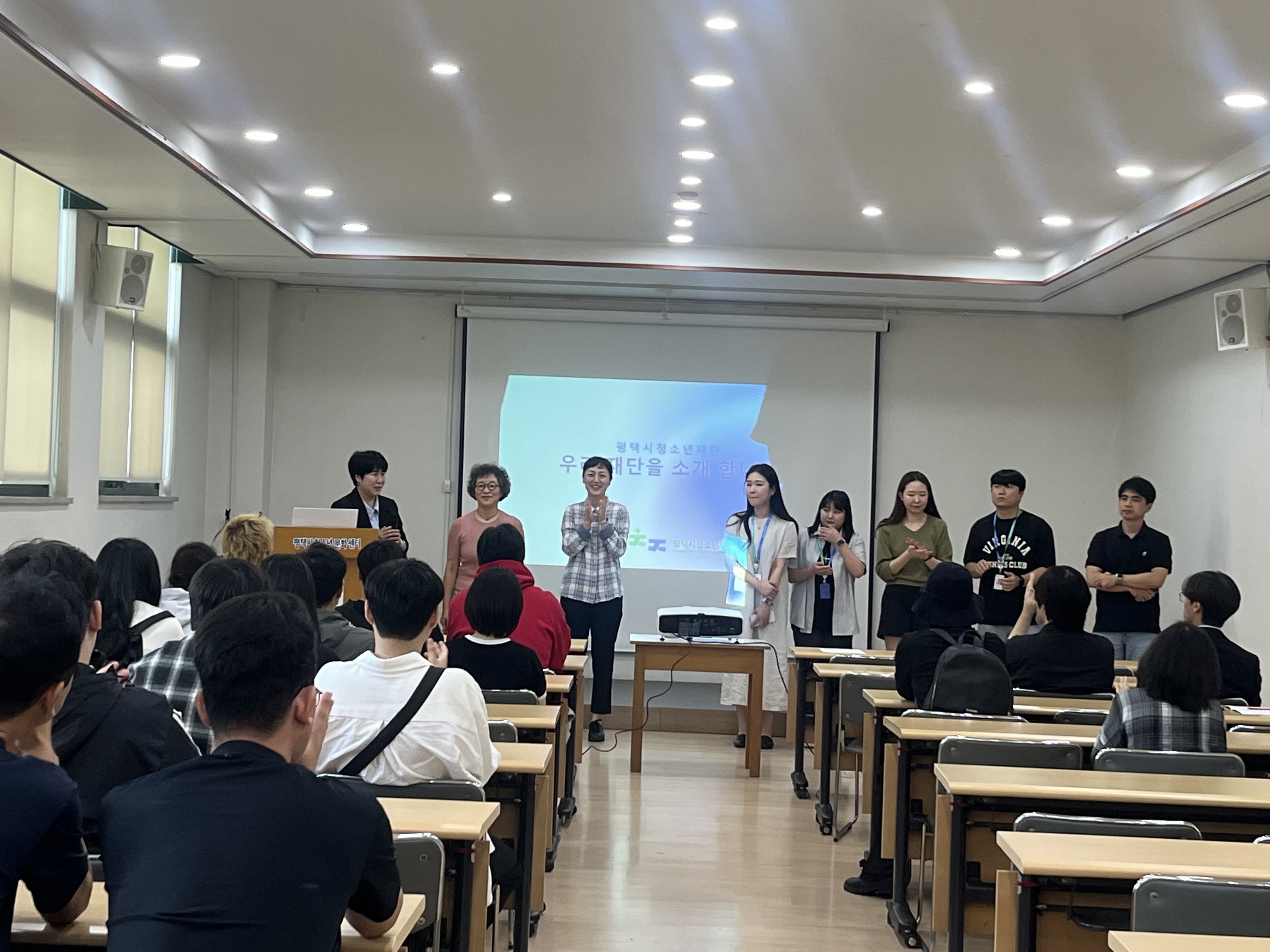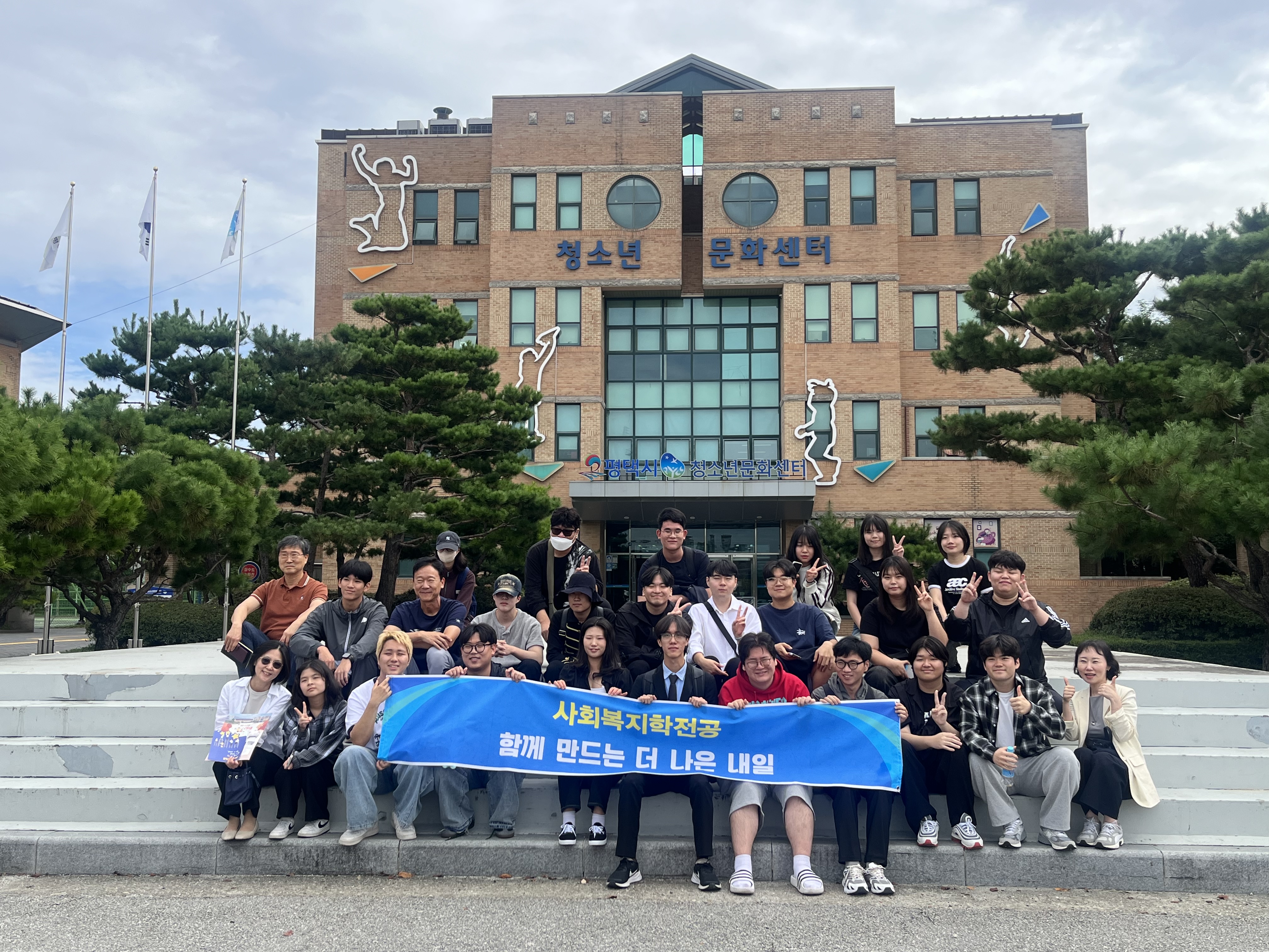 2025년 9월 23일 사회복지학과 학우분들과 교수님 두 분과 함께 평택시 청소년재단을 방문하였습니다.