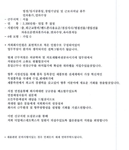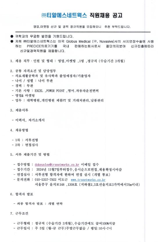 서울특별시 중구에 위치한 주식회사 티알에스네트웍스에서 직원을 첨부와 같이 채용하고자 공고문을 게시합니다.