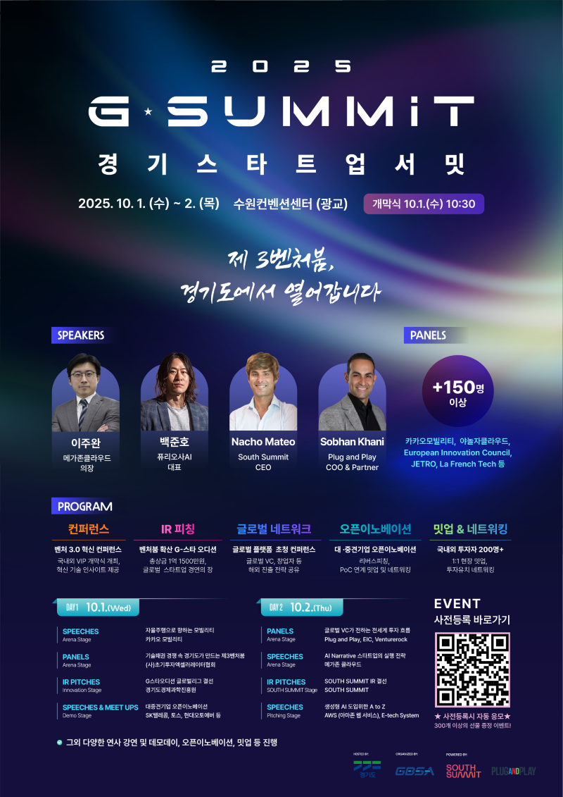 fnctId=bbs,fnctNo=716 단축 url 글번호 88941 2025 경기 스타트업 서밋(G-SUMMIT 2025) 안내 작성일 2025.09.23 수정일 2025.09.23 작성자 산학협력단 조회수 57 - 행사명: 2025 경기 스타트업 서밋(G-SUMMIT 2025) - 행사기간: 2025. 10. 1.(수)~10. 2.(목) - 행사장소: 광교(수원컨벤션센터) 첨부파일 첨부파일이(가) 없습니다.