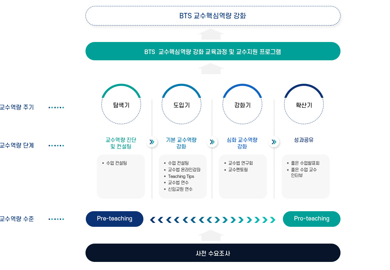 - 우리 대학 교수의 요구조사에 기초하여 4영역의 교수역량 주기별, 단계별, 수준별 프로그램으로 구성