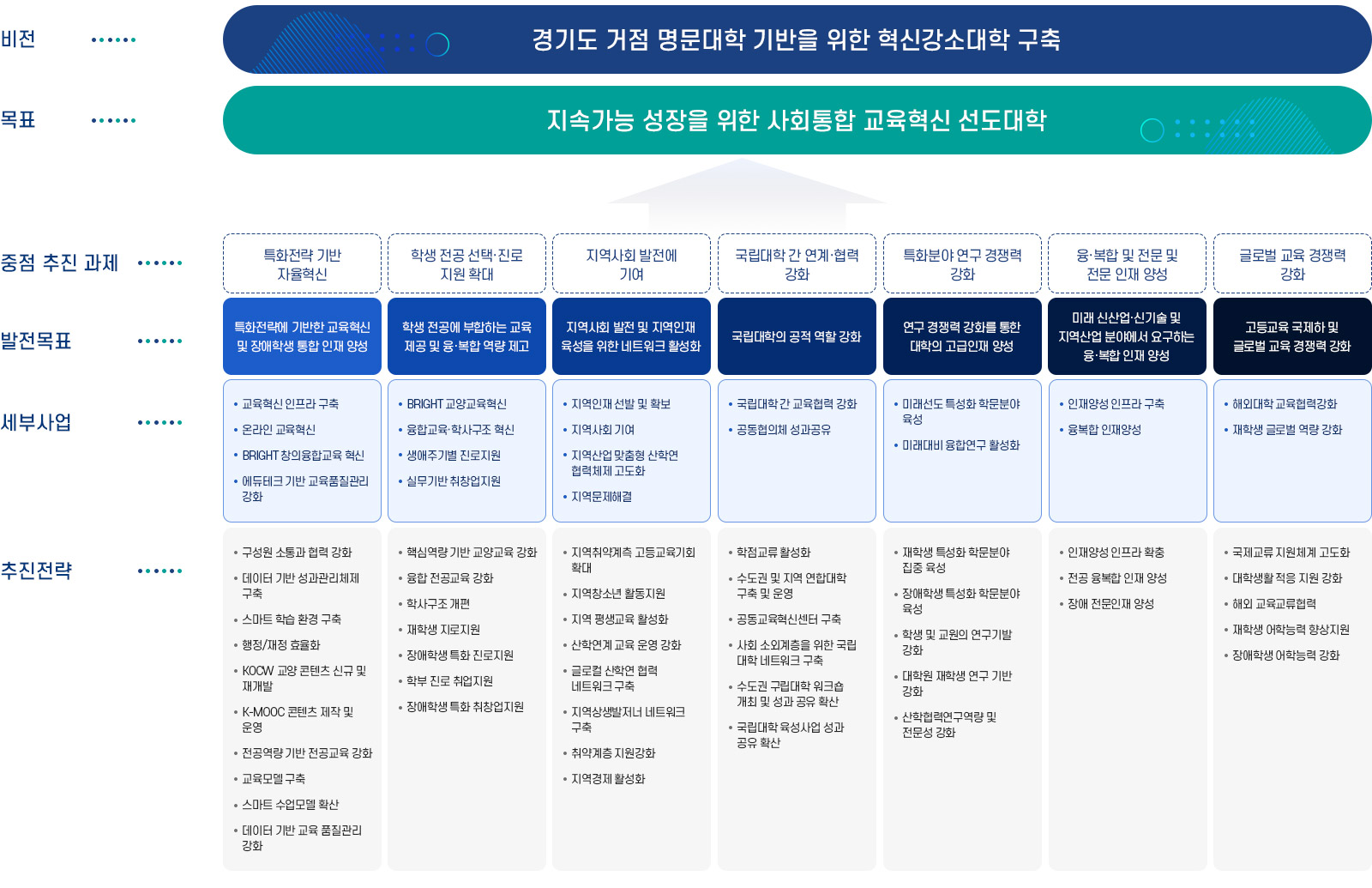 국립대학의 공적 역할 강화를 위한 지원을 통해 지역고등교육발전 생태계 조성 및 국가 균형발전을 선도하고자 함 우리대학의 사업목표 및 전략 한경국립대학교는 4차 산업을 선도하는 인재양성과 혁신을 통해 미래에 도전하기 위한 「한경비전2030」중장기발전계획을 수립하고 「미래를 향해 길을 열어가는 경기 대표 국립대학」을 비전으로 선포 지속가능 성장을 위한 사회통합 교육혁신 선도하는 경기도 대표 국립대학을 위하여 경기도 거점 명문대학 기반을 위한 혁신강소대학을 구축하고자 함