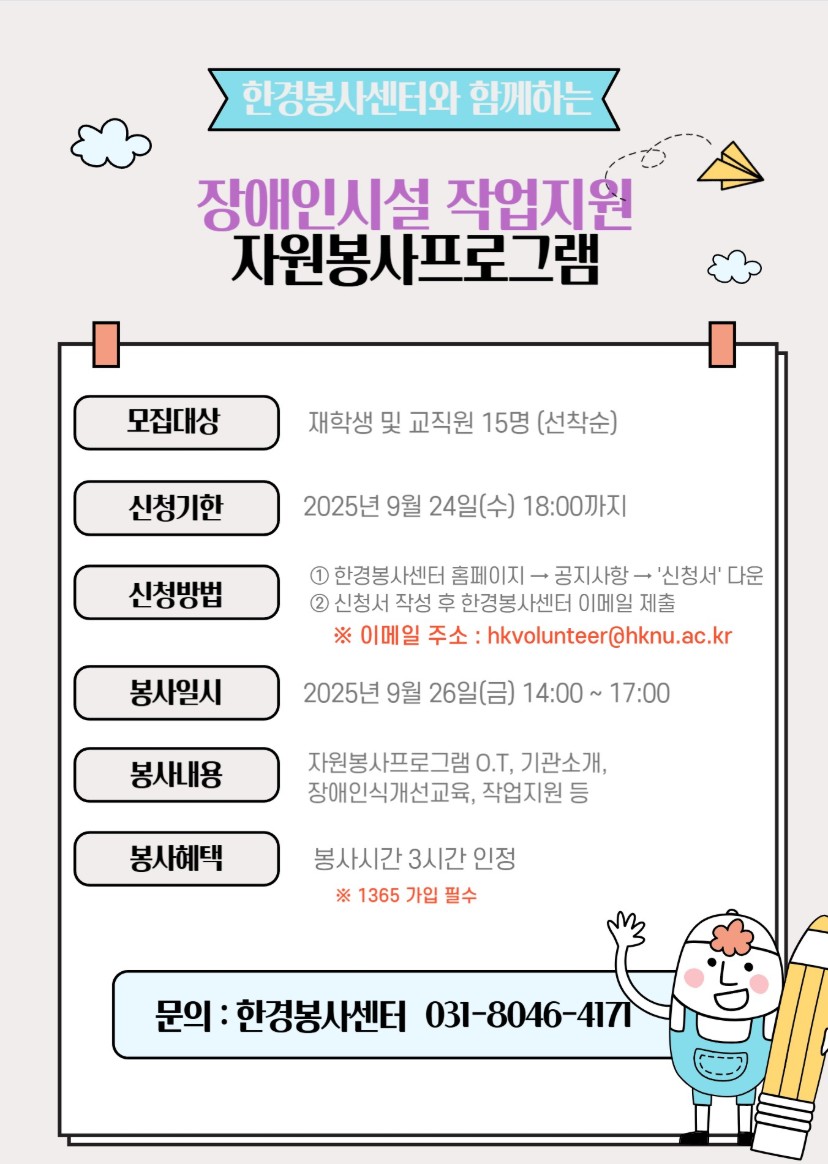 fnctId=bbs,fnctNo=374 단축 url 글번호 88796 2025학년도 평안밀알복지재단 봉사활동 참여자 모집 작성일 2025.09.18 수정일 2025.09.18 작성자 최다솔 조회수 622 첨부파일 참여 홍보 포스터.jpg (붙임1) 자원봉사활동 참가신청서_교직원(서식).hwp (붙임2) 자원봉사활동 참가신청서_학생용(서식).hwp