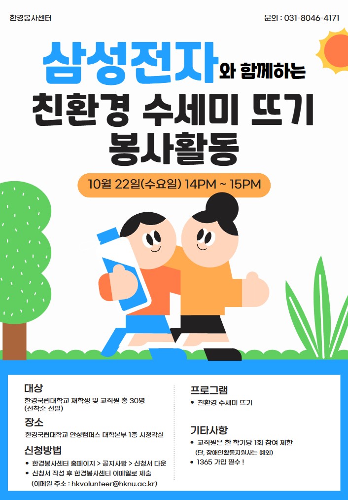 fnctId=bbs,fnctNo=374 단축 url 글번호 89220 2025학년도 삼성전자와 함께하는 친환경 수세미 뜨기 봉사활동 참여자 모집 작성일 2025.10.02 수정일 2025.10.02 작성자 최다솔 조회수 556 참여자 모집 기간 : ~ 2025.10.14.(화) 18시까지 (선착순 마감) 첨부파일 참여 홍보 포스터.jpg (붙임1) 자원봉사활동 참가신청서_교직원(서식).hwp (붙임2) 자원봉사활동 참가신청서_학생용(서식).hwp