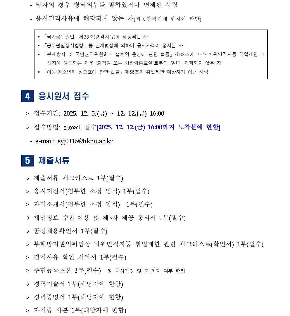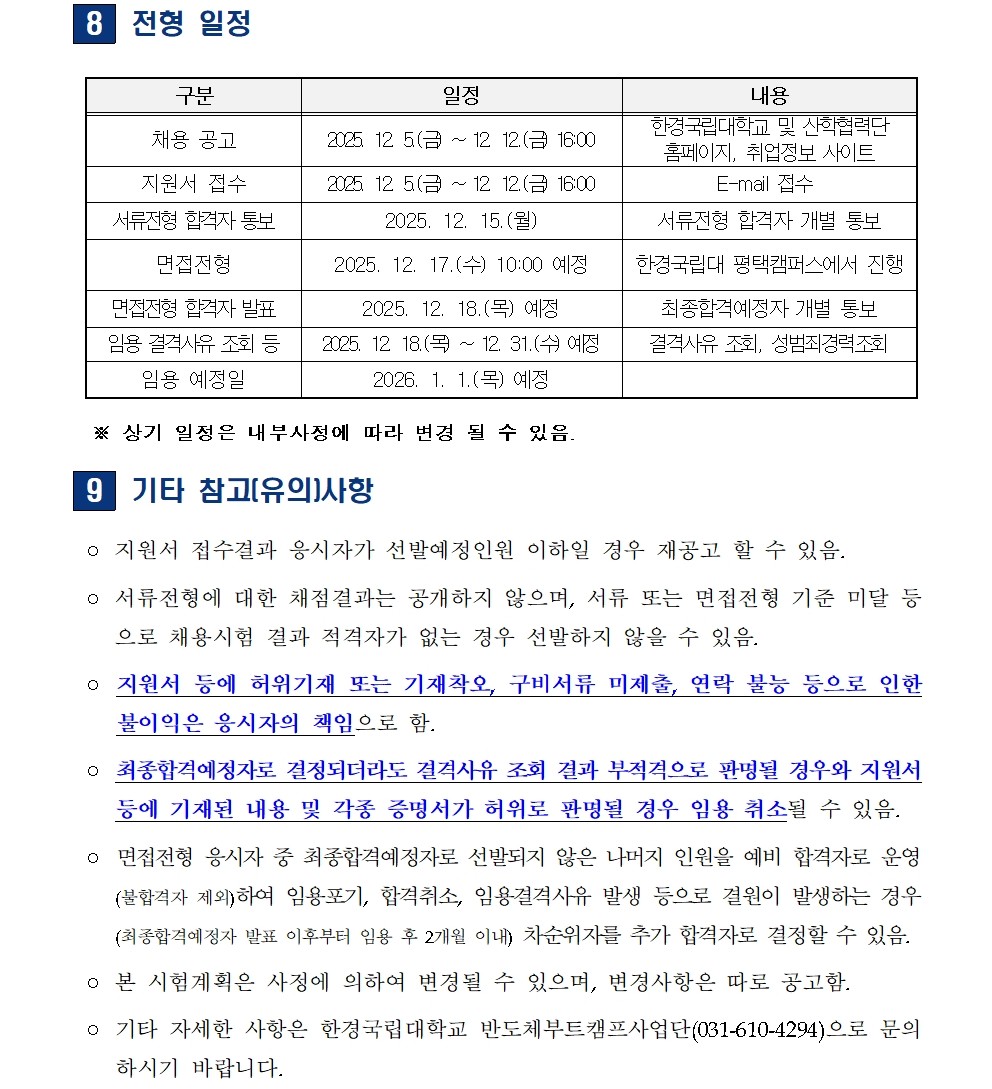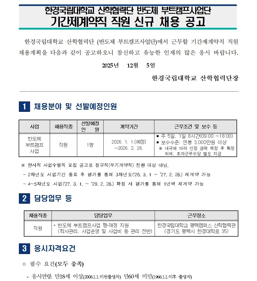fnctId=bbs,fnctNo=350 단축 url 글번호 90896 [채용공고] 한경국립대학교 산학협력단 반도체 부트캠프사업단 계약직원 신규 채용 작성일 2025.12.05 수정일 2025.12.05 작성자 산학협력단 조회수 107 첨부파일 반도체 부트캠프사업단 기간제계약직 직원 신규 채용 공고문.hwp