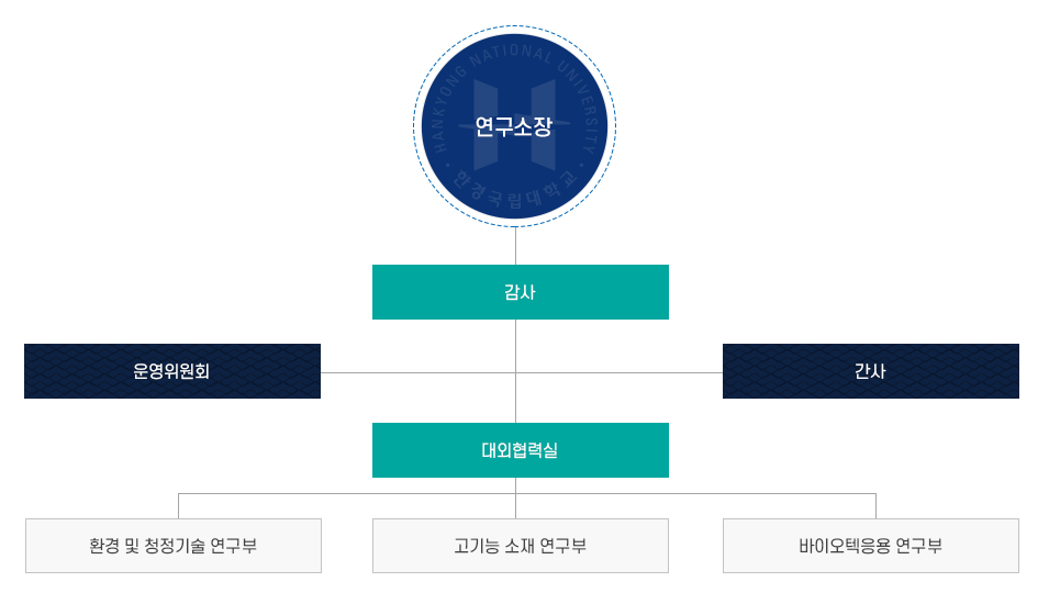 화학기술과 관련된 각종 연구를 효율적으로 수행하기 위하여 위의 기구표와 같이 3개의 화학기술 전문연구부와 각 연구부의 업무지원, 화학기술 분야 정보 시스템 구축, 산․학 협력 지원을 위한 대외협력실로 구성되어 있다. 또한 연구소 운영과 관련하여 심의기구인 운영위원회를 두어 각종 안건을 심의하고 연구소 회계 및 제반운영을 감사하여 운영위원회에 보고하는 감사를 두고 있다.