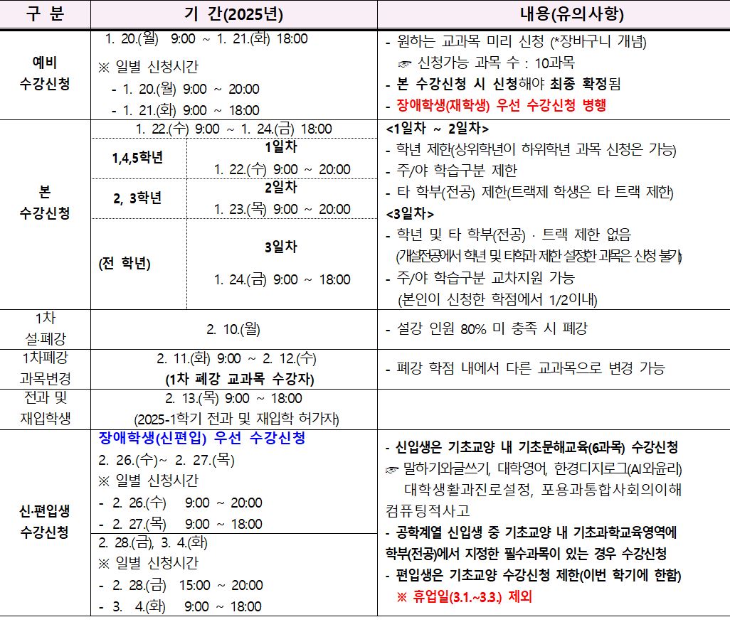 fnctId=bbs,fnctNo=344 단축 url 글번호 81701 2025-1학기 수강신청 안내 작성일 2025.01.13 수정일 2025.01.13 작성자 서** 조회수 2945 첨부파일 복사본 붙임8. 2025학년도 공학계열 전공별 필수이수 교양(기초과학교육) 지정현황.xlsx 붙임1. 2025-1학기 수강신청 안내 (공통사항).hwp 붙임2. 수강신청 Q&A 모음.hwp 붙임5. 2025-1학기 수강신청 안내 (2024학번 이후).hwp 붙임6. 수강신청매뉴얼.hwp