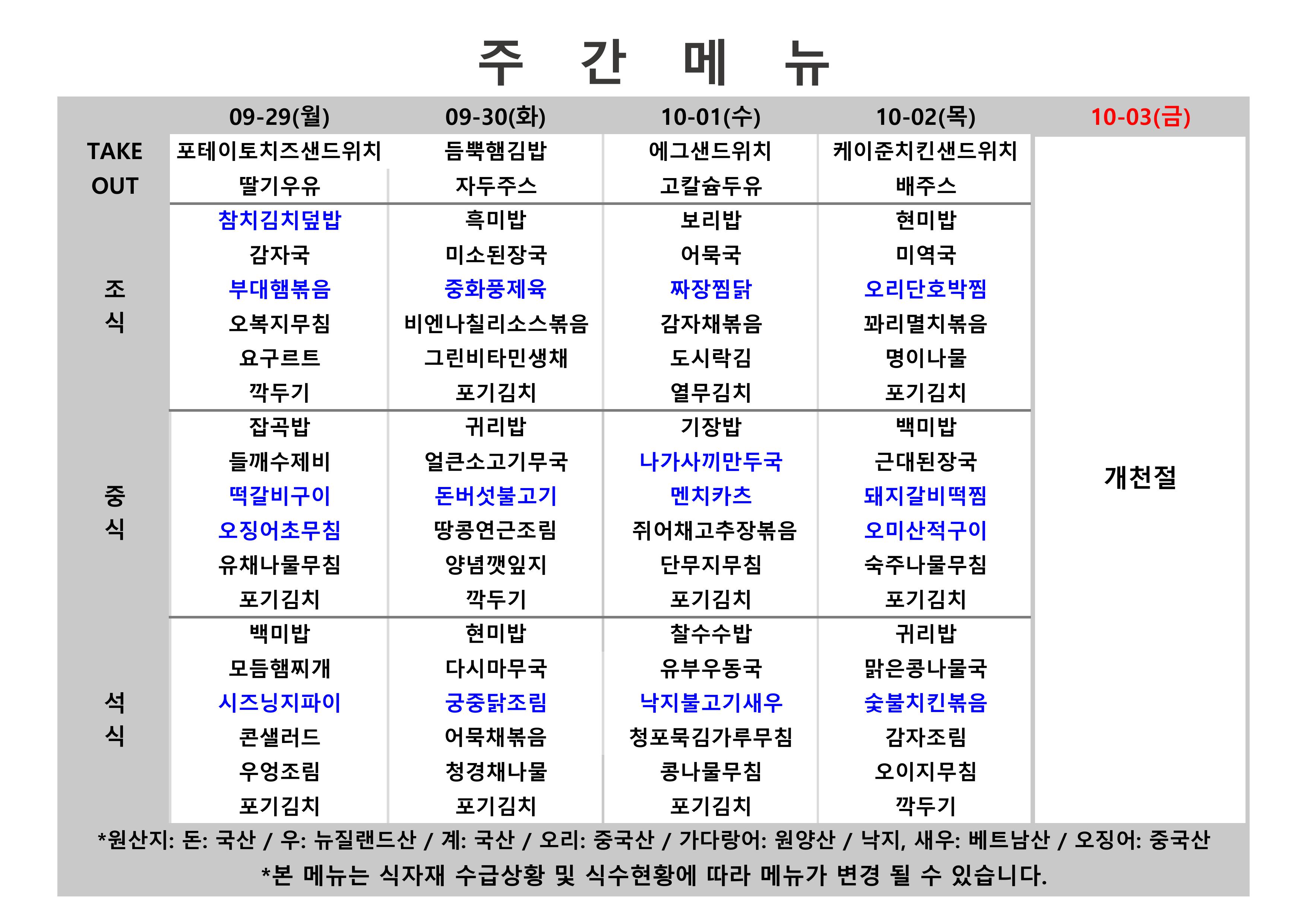 fnctId=bbs,fnctNo=484 단축 url 글번호 88990 2025. 9. 29. ~ 2025. 10. 3. 주간식단표 작성일 2025.09.25 수정일 2025.09.25 작성자 학생생활관(분원) 조회수 1103 다음글 2025. 10. 06. ~ 2025. 10. 10. 주간식단표 윤현지 2025-10-02 11:27:25.0 이전글 2025. 9. 22. ~ 2025. 9. 26. 주간식단표 윤현지 2025-09-19 10:43:32.0 RSS 2.0 총 77 개의 게시물이 있습니다. 게시물 검색 제목 작성자 게시글 리스트 학생생활관 이용 - 주간식단 번호 제목 작성자 작성일 조회수 77 2025. 10. 13. ~ 2025. 10. 17. 주간식단표 학생생활관(분원) 2025.10.02 593 76 2025. 10. 06. ~ 2025. 10. 10. 주간식단표 학생생활관(분원) 2025.10.02 576 75 2025. 9. 29. ~ 2025. 10. 3. 주간식단표 학생생활관(분원) 2025.09.25 1103 74 2025. 9. 22. ~ 2025. 9. 26. 주간식단표 학생생활관(분원) 2025.09.19 640 73 2025. 9. 15. ~ 2025. 9. 19. 주간식단표 학생생활관(분원) 2025.09.11 816 72 2025. 9. 8. ~ 2025. 9. 12. 주간식단표 학생생활관(분원) 2025.09.06 1137 71 2025. 9. 1. ~ 2025. 9. 5. 주간식단표 학생생활관(분원) 2025.08.27 754 70 2025. 8. 11. ~ 2025. 8. 14. 주간식단표 학생생활관(분원) 2025.08.07 1406 69 2025. 8. 4. ~ 2025. 8. 8. 주간식단표 학생생활관(분원) 2025.08.01 1348 68 2025. 7. 28. ~ 2025. 8. 1. 주간식단표 학생생활관(분원) 2025.07.25 1242 67 2025. 7. 21. ~ 2025. 7. 25. 주간식단표 학생생활관(분원) 2025.07.17 1237 66 2025. 7. 14. ~ 2025. 7. 18. 주간식단표 학생생활관(분원) 2025.07.11 1333 65 2025. 7. 7. ~ 2025. 7. 11. 주간식단표 학생생활관(분원) 2025.07.04 1328 64 2025. 6. 30. ~ 2025. 7. 4. 주간식단표 학생생활관(분원) 2025.06.27 1424 63 2025. 6. 23. ~ 2025. 6. 27. 주간식단표 학생생활관(분원) 2025.06.20 1474 62 2025. 6. 16. ~ 2025. 6. 20. 주간식단표 학생생활관(분원) 2025.06.13 1813 61 2025. 6. 9. ~ 2025. 6. 13. 주간식단표 학생생활관(분원) 2025.06.05 2307 60 2025. 6. 2. ~ 2025. 6. 6. 주간식단표 학생생활관(분원) 2025.05.30 2500 59 2025. 5. 26. ~ 2025. 5. 30. 주간식단표 학생생활관(분원) 2025.05.23 2405 58 2025. 5. 19. ~ 2025. 5. 23. 주간식단표 학생생활관(분원) 2025.05.16 1856 57 2025. 5. 12. ~ 2025. 5. 16. 주간식단표 학생생활관(분원) 2025.05.09 2003 56 2025. 5. 5. ~ 2025. 5. 9. 주간식단표 학생생활관(분원) 2025.05.02 2001 55 2025. 4. 28. ~ 2025. 5. 2. 주간식단표 학생생활관(분원) 2025.04.25 1996 54 2025. 4. 21. ~ 2025. 4. 25. 주간식단표 학생생활관(분원) 2025.04.18 2007 53 2025. 4. 14. ~ 2025. 4. 18. 주간식단표 학생생활관(분원) 2025.04.15 1898 52 2025. 4. 7. ~ 2025. 4. 11. 주간식단표 학생생활관(분원) 2025.04.07 1867 51 2025. 3 .31. ~ 2025. 4. 4. 주간식단표 학생생활관(분원) 2025.03.31 2013 50 2025. 3. 24. ~ 2025. 3. 28. 주간식단표 학생생활관(분원) 2025.03.24 2072 49 2025. 3. 10. ~ 2025. 3. 14. 주간식단표 학생생활관(분원) 2025.03.10 2376 48 2025. 2. 10.~2025. 2. 14. 주간식단표 학생생활관(분원) 2025.02.10 2410 47 2025. 2 . 3.~2025. 2. 7. 주간식단표 학생생활관(분원) 2025.02.03 2343 46 2025. 1. 20. ~ 2025. 1. 24. 주간식단표 학생생활관(분원) 2025.01.20 2199 45 2025. 1. 13. ~ 2025. 1. 17. 주간식단표 학생생활관(분원) 2025.01.10 2128 44 2025. 1. 6. ~ 2025. 1. 10. 주간식단표 학생생활관(분원) 2025.01.06 2224 43 2024. 12. 30. ~ 2025. 1. 3. 주간식단표 학생생활관(분원) 2024.12.31 2233 42 2024. 12. 16.~2024. 12. 20. 주간식단표 학생생활관(분원) 2024.12.16 2294 41 2024. 12. 2.~ 2024. 12. 6. 주간식단표 학생생활관(분원) 2024.12.02 2232 40 2024. 11. 18.~2024. 11. 22. 주간식단표 학생생활관(분원) 2024.11.18 2426 39 2024. 11. 11.~2024. 11. 15. 주간식단표 학생생활관(분원) 2024.11.11 2384 38 2024. 11. 4.~2024.11. 8. 주간식단표 학생생활관(분원) 2024.11.04 2483 37 2024. 10. 21. ~ 2024. 10. 25. 주간식단표 학생생활관(분원) 2024.10.21 2627 36 2024. 10. 14. ~ 2024. 10. 18. 주간식단표 학생생활관(분원) 2024.10.14 2485 35 2024. 10. 7. ~ 2024. 10. 11. 주간식단표 학생생활관(분원) 2024.10.07 2464 34 2024. 9. 30. ~ 2024. 10. 4. 주간식단표 학생생활관(분원) 2024.09.30 2440 33 2024. 9. 23. ~ 2024. 9. 27. 주간식단표 학생생활관(분원) 2024.09.23 4304 32 2024. 9. 16. ~ 2024. 9. 20. 주간식단표 학생생활관(분원) 2024.09.13 2602 31 2024. 9. 9. ~ 2024. 9. 13. 주간식단표 학생생활관(분원) 2024.09.06 2574 30 2024. 9. 2. ~ 2024. 9. 6. 주간식단표 학생생활관(분원) 2024.09.03 2715 29 2024. 8. 26. ~ 2024. 8. 30. 주간식단표 학생생활관(분원) 2024.08.26 3058 28 2024. 8. 19. ~ 2024. 8. 23. 주간식단표 학생생활관(분원) 2024.08.19 3226 27 2024. 8. 12. ~ 2024. 8. 16. 주간식단표 학생생활관(분원) 2024.08.09 3526 26 2024. 8. 5. ~ 2024. 8. 9. 주간식단표 학생생활관(분원) 2024.08.05 3421 25 2024. 7. 29. ~ 2024. 8. 2. 주간식단표 학생생활관(분원) 2024.07.29 3519 24 2024. 7. 22. ~ 2024. 7. 26. 주간식단표 학생생활관(분원) 2024.07.22 3589 23 2024. 7. 15. ~ 2024. 7. 19. 주간식단표 학생생활관(분원) 2024.07.15 3786 22 2024. 7. 8. ~ 2024. 7. 12. 주간식단표 학생생활관(분원) 2024.07.08 3956 21 2024. 7. 1. ~ 2024. 7. 5. 주간식단표 학생생활관(분원) 2024.07.02 4158 20 2024. 6. 24. ~ 2024. 6. 28. 주간식단표 학생생활관(분원) 2024.06.24 4333 19 2024. 6. 17. ~ 2024. 6. 21. 주간식단표 학생생활관(분원) 2024.06.17 4271 18 2024. 6. 10. ~ 2024. 6. 14. 주간식단표 학생생활관(분원) 2024.06.10 5513 17 2024. 6. 3. ~ 2024. 6. 7. 주간식단표 학생생활관(분원) 2024.06.03 8550 16 2024. 5. 27. ~ 2024. 5. 31. 주간식단표 학생생활관(분원) 2024.05.28 8657 15 2024. 5. 20. ~ 2024. 5. 24. 주간식단표 학생생활관(분원) 2024.05.20 3659 14 2024. 