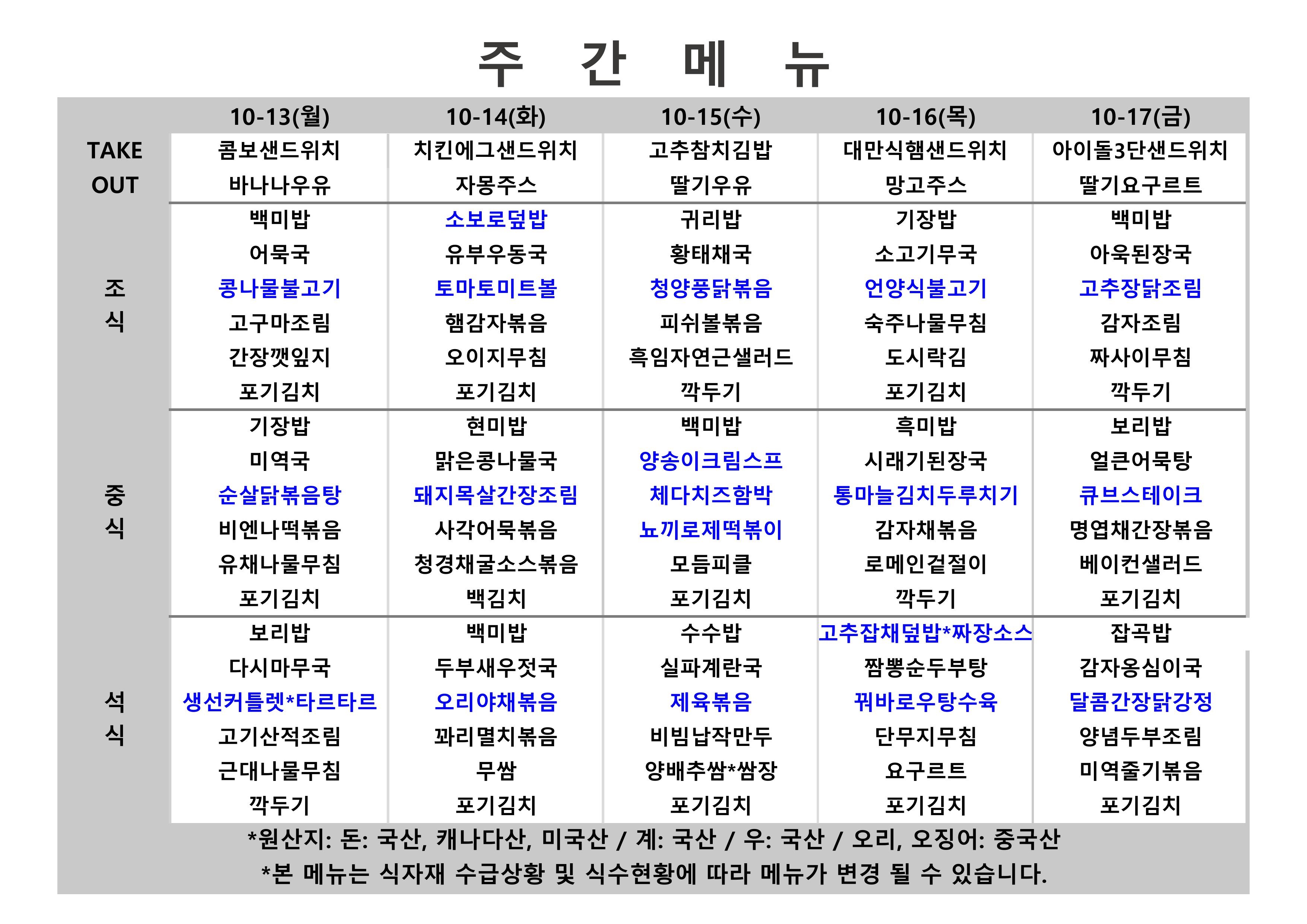 fnctId=bbs,fnctNo=484 단축 url 글번호 89207 2025. 10. 13. ~ 2025. 10. 17. 주간식단표 작성일 2025.10.02 수정일 2025.10.02 작성자 학생생활관(분원) 조회수 594 다음글 이전글 2025. 10. 06. ~ 2025. 10. 10. 주간식단표 윤현지 2025-10-02 11:27:25.0 RSS 2.0 총 77 개의 게시물이 있습니다. 게시물 검색 제목 작성자 게시글 리스트 학생생활관 이용 - 주간식단 번호 제목 작성자 작성일 조회수 77 2025. 10. 13. ~ 2025. 10. 17. 주간식단표 학생생활관(분원) 2025.10.02 594 76 2025. 10. 06. ~ 2025. 10. 10. 주간식단표 학생생활관(분원) 2025.10.02 577 75 2025. 9. 29. ~ 2025. 10. 3. 주간식단표 학생생활관(분원) 2025.09.25 1103 74 2025. 9. 22. ~ 2025. 9. 26. 주간식단표 학생생활관(분원) 2025.09.19 640 73 2025. 9. 15. ~ 2025. 9. 19. 주간식단표 학생생활관(분원) 2025.09.11 816 72 2025. 9. 8. ~ 2025. 9. 12. 주간식단표 학생생활관(분원) 2025.09.06 1138 71 2025. 9. 1. ~ 2025. 9. 5. 주간식단표 학생생활관(분원) 2025.08.27 754 70 2025. 8. 11. ~ 2025. 8. 14. 주간식단표 학생생활관(분원) 2025.08.07 1406 69 2025. 8. 4. ~ 2025. 8. 8. 주간식단표 학생생활관(분원) 2025.08.01 1348 68 2025. 7. 28. ~ 2025. 8. 1. 주간식단표 학생생활관(분원) 2025.07.25 1242 67 2025. 7. 21. ~ 2025. 7. 25. 주간식단표 학생생활관(분원) 2025.07.17 1238 66 2025. 7. 14. ~ 2025. 7. 18. 주간식단표 학생생활관(분원) 2025.07.11 1334 65 2025. 7. 7. ~ 2025. 7. 11. 주간식단표 학생생활관(분원) 2025.07.04 1328 64 2025. 6. 30. ~ 2025. 7. 4. 주간식단표 학생생활관(분원) 2025.06.27 1424 63 2025. 6. 23. ~ 2025. 6. 27. 주간식단표 학생생활관(분원) 2025.06.20 1474 62 2025. 6. 16. ~ 2025. 6. 20. 주간식단표 학생생활관(분원) 2025.06.13 1813 61 2025. 6. 9. ~ 2025. 6. 13. 주간식단표 학생생활관(분원) 2025.06.05 2307 60 2025. 6. 2. ~ 2025. 6. 6. 주간식단표 학생생활관(분원) 2025.05.30 2500 59 2025. 5. 26. ~ 2025. 5. 30. 주간식단표 학생생활관(분원) 2025.05.23 2405 58 2025. 5. 19. ~ 2025. 5. 23. 주간식단표 학생생활관(분원) 2025.05.16 1857 57 2025. 5. 12. ~ 2025. 5. 16. 주간식단표 학생생활관(분원) 2025.05.09 2003 56 2025. 5. 5. ~ 2025. 5. 9. 주간식단표 학생생활관(분원) 2025.05.02 2002 55 2025. 4. 28. ~ 2025. 5. 2. 주간식단표 학생생활관(분원) 2025.04.25 1997 54 2025. 4. 21. ~ 2025. 4. 25. 주간식단표 학생생활관(분원) 2025.04.18 2007 53 2025. 4. 14. ~ 2025. 4. 18. 주간식단표 학생생활관(분원) 2025.04.15 1898 52 2025. 4. 7. ~ 2025. 4. 11. 주간식단표 학생생활관(분원) 2025.04.07 1868 51 2025. 3 .31. ~ 2025. 4. 4. 주간식단표 학생생활관(분원) 2025.03.31 2014 50 2025. 3. 24. ~ 2025. 3. 28. 주간식단표 학생생활관(분원) 2025.03.24 2073 49 2025. 3. 10. ~ 2025. 3. 14. 주간식단표 학생생활관(분원) 2025.03.10 2376 48 2025. 2. 10.~2025. 2. 14. 주간식단표 학생생활관(분원) 2025.02.10 2410 47 2025. 2 . 3.~2025. 2. 7. 주간식단표 학생생활관(분원) 2025.02.03 2343 46 2025. 1. 20. ~ 2025. 1. 24. 주간식단표 학생생활관(분원) 2025.01.20 2199 45 2025. 1. 13. ~ 2025. 1. 17. 주간식단표 학생생활관(분원) 2025.01.10 2129 44 2025. 1. 6. ~ 2025. 1. 10. 주간식단표 학생생활관(분원) 2025.01.06 2225 43 2024. 12. 30. ~ 2025. 1. 3. 주간식단표 학생생활관(분원) 2024.12.31 2234 42 2024. 12. 16.~2024. 12. 20. 주간식단표 학생생활관(분원) 2024.12.16 2294 41 2024. 12. 2.~ 2024. 12. 6. 주간식단표 학생생활관(분원) 2024.12.02 2232 40 2024. 11. 18.~2024. 11. 22. 주간식단표 학생생활관(분원) 2024.11.18 2427 39 2024. 11. 11.~2024. 11. 15. 주간식단표 학생생활관(분원) 2024.11.11 2384 38 2024. 11. 4.~2024.11. 8. 주간식단표 학생생활관(분원) 2024.11.04 2483 37 2024. 10. 21. ~ 2024. 10. 25. 주간식단표 학생생활관(분원) 2024.10.21 2628 36 2024. 10. 14. ~ 2024. 10. 18. 주간식단표 학생생활관(분원) 2024.10.14 2486 35 2024. 10. 7. ~ 2024. 10. 11. 주간식단표 학생생활관(분원) 2024.10.07 2465 34 2024. 9. 30. ~ 2024. 10. 4. 주간식단표 학생생활관(분원) 2024.09.30 2440 33 2024. 9. 23. ~ 2024. 9. 27. 주간식단표 학생생활관(분원) 2024.09.23 4306 32 2024. 9. 16. ~ 2024. 9. 20. 주간식단표 학생생활관(분원) 2024.09.13 2602 31 2024. 9. 9. ~ 2024. 9. 13. 주간식단표 학생생활관(분원) 2024.09.06 2574 30 2024. 9. 2. ~ 2024. 9. 6. 주간식단표 학생생활관(분원) 2024.09.03 2715 29 2024. 8. 26. ~ 2024. 8. 30. 주간식단표 학생생활관(분원) 2024.08.26 3059 28 2024. 8. 19. ~ 2024. 8. 23. 주간식단표 학생생활관(분원) 2024.08.19 3226 27 2024. 8. 12. ~ 2024. 8. 16. 주간식단표 학생생활관(분원) 2024.08.09 3527 26 2024. 8. 5. ~ 2024. 8. 9. 주간식단표 학생생활관(분원) 2024.08.05 3422 25 2024. 7. 29. ~ 2024. 8. 2. 주간식단표 학생생활관(분원) 2024.07.29 3519 24 2024. 7. 22. ~ 2024. 7. 26. 주간식단표 학생생활관(분원) 2024.07.22 3590 23 2024. 7. 15. ~ 2024. 7. 19. 주간식단표 학생생활관(분원) 2024.07.15 3786 22 2024. 7. 8. ~ 2024. 7. 12. 주간식단표 학생생활관(분원) 2024.07.08 3956 21 2024. 7. 1. ~ 2024. 7. 5. 주간식단표 학생생활관(분원) 2024.07.02 4159 20 2024. 6. 24. ~ 2024. 6. 28. 주간식단표 학생생활관(분원) 2024.06.24 4334 19 2024. 6. 17. ~ 2024. 6. 21. 주간식단표 학생생활관(분원) 2024.06.17 4271 18 2024. 6. 10. ~ 2024. 6. 14. 주간식단표 학생생활관(분원) 2024.06.10 5513 17 2024. 6. 3. ~ 2024. 6. 7. 주간식단표 학생생활관(분원) 2024.06.03 8550 16 2024. 5. 27. ~ 2024. 5. 31. 주간식단표 학생생활관(분원) 2024.05.28 8657 15 2024. 5. 20. ~ 2024. 5. 24. 주간식단표 학생생활관(분원) 2024.05.20 3659 14 2024. 5. 13. ~ 2024. 5. 17. 주간식단표 학생생활관(분원) 2024.05.13 39